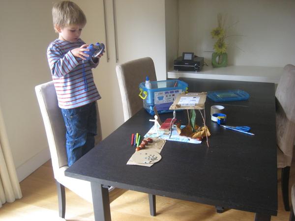 Arthur prend en photo ses constructions artistiques