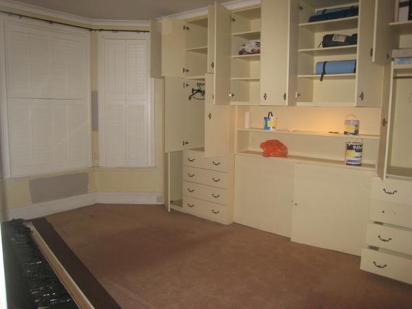 La chambre avant rafraichissement : moquette tachee, poignees de placard moches et du jaune, beaucoup de jaune sur les murs!